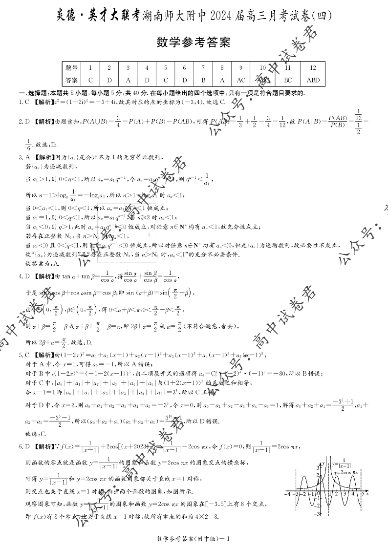 湖南师范大学附属中学2023-2024学年高三上学期月考卷(四)数学答案