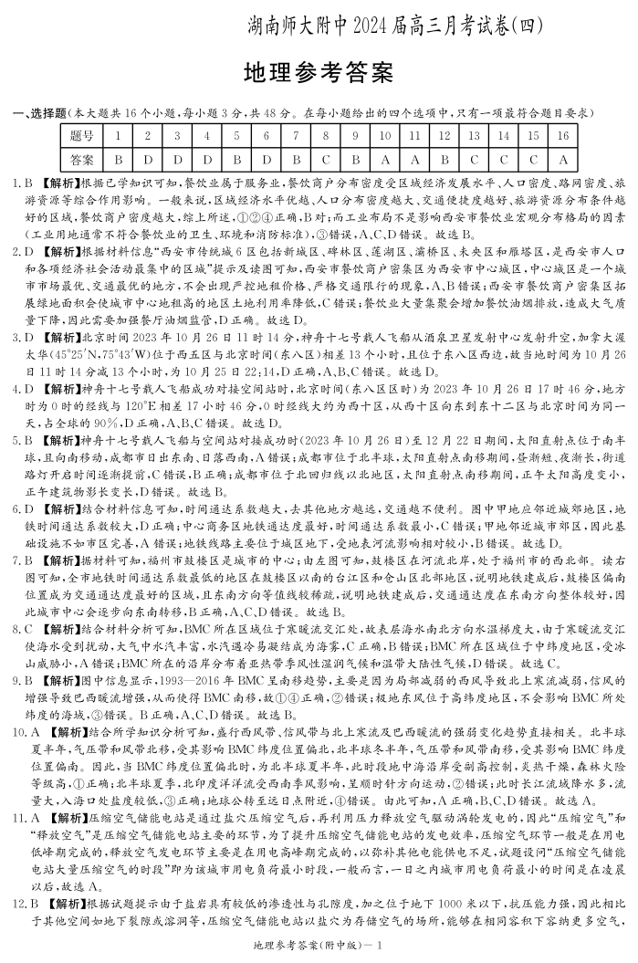 湖南师范大学附属中学2023-2024学年高三上学期月考卷(四)地理答案