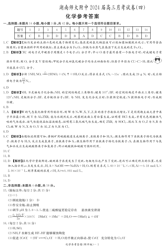 湖南师范大学附属中学2023-2024学年高三上学期月考卷(四)化学答案