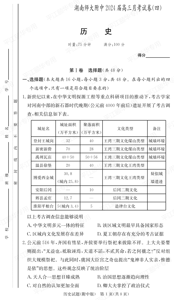 湖南师范大学附属中学2023-2024学年高三上学期月考卷(四)历史