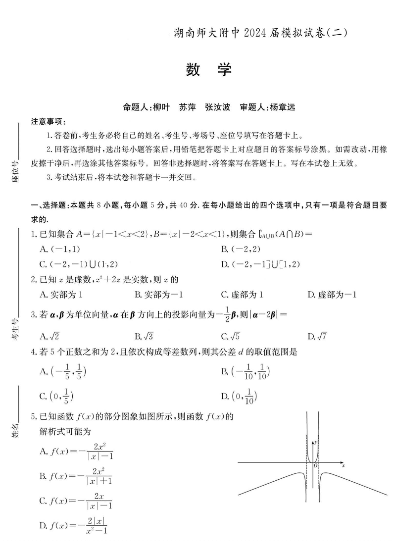 2024届湖南师范大学附属中学高三下学期模拟(二)数学
