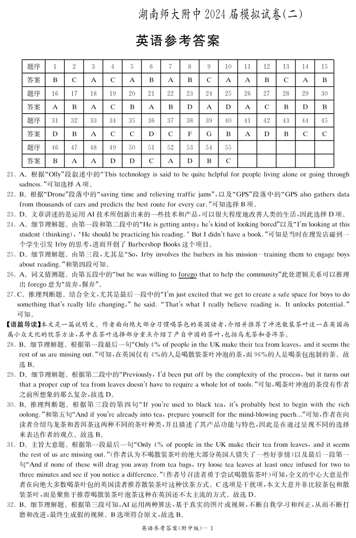 2024届湖南师范大学附属中学高三下学期模拟(二)英语答案