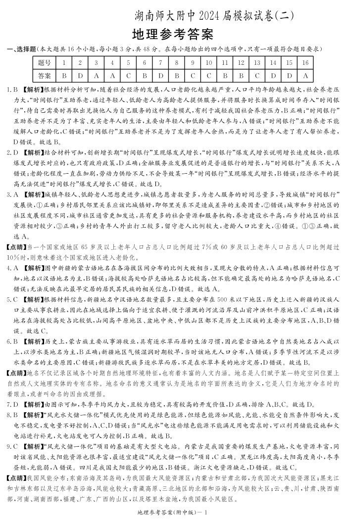 2024届湖南师范大学附属中学高三下学期模拟(二)地理答案