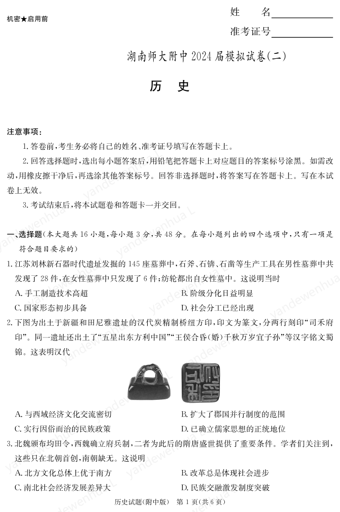 2024届湖南师范大学附属中学高三下学期模拟(二)历史