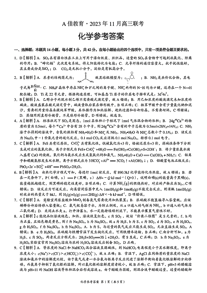 湖南省A佳教育2023-2024学年高三上学期11月联考 化学答案
