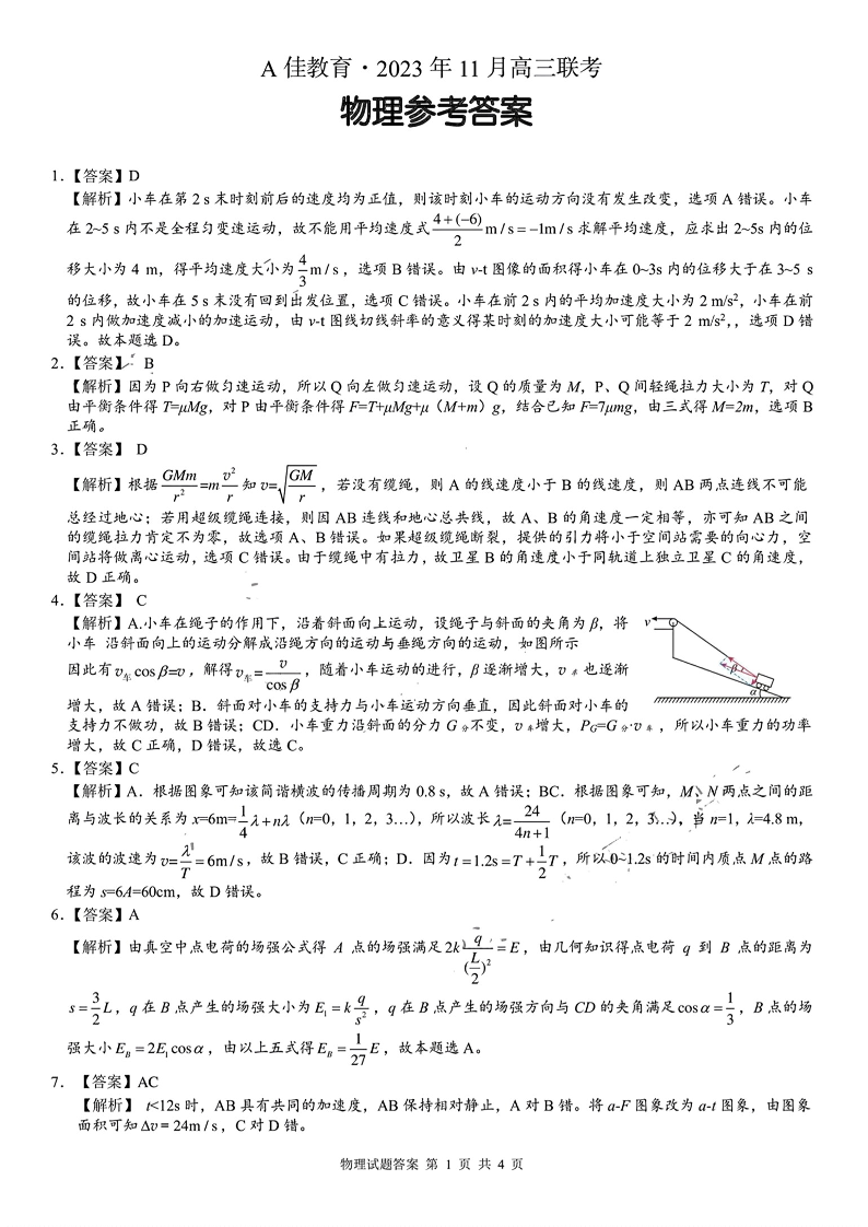 湖南省A佳教育2023-2024学年高三上学期11月联考 物理答案
