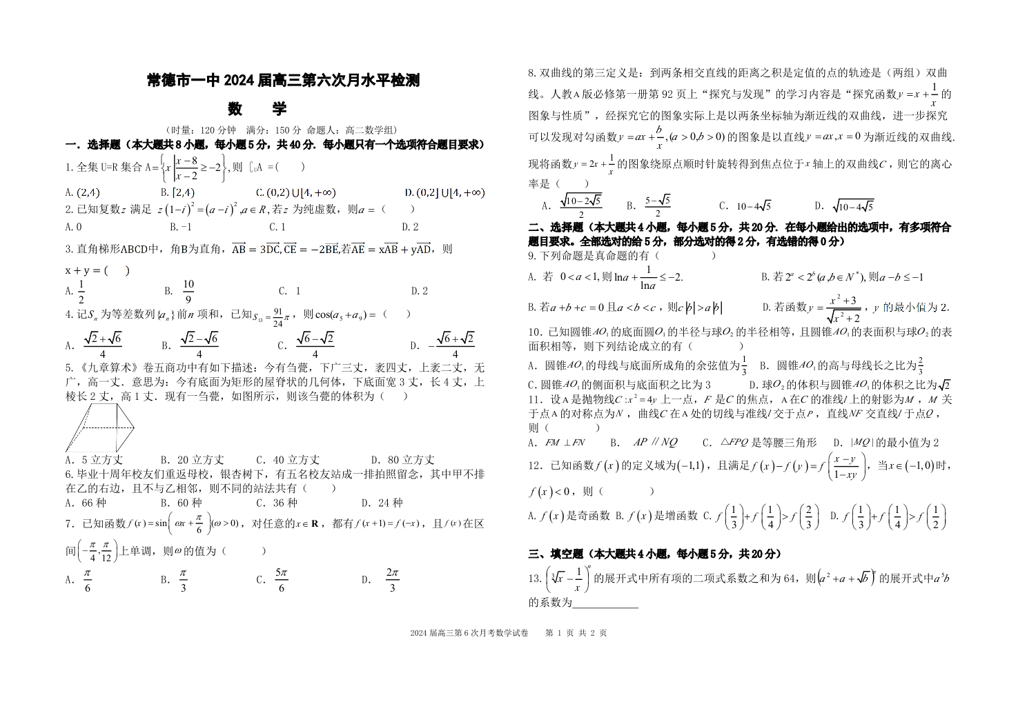 湖南省常德市第一中学2023-2024学年高三上学期第六次月考 数学