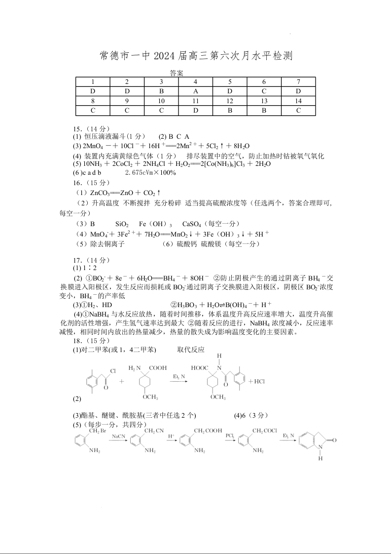 湖南省常德市第一中学2023-2024学年高三上学期第六次月考 化学答案