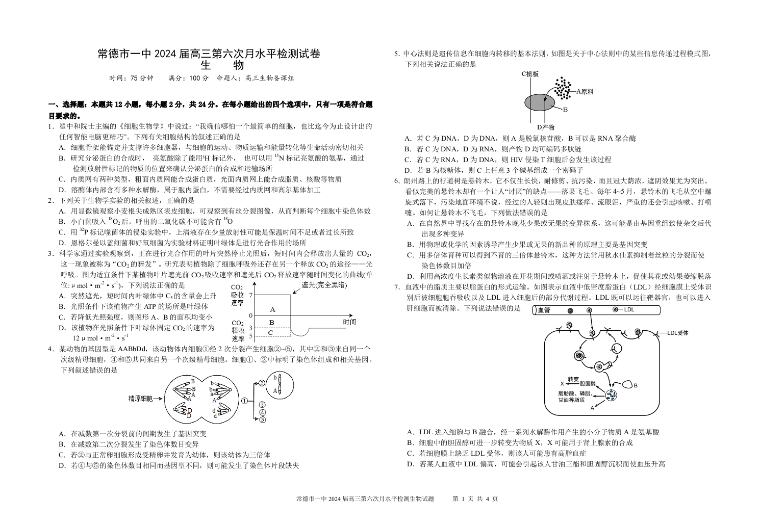 湖南省常德市第一中学2023-2024学年高三上学期第六次月考 生物