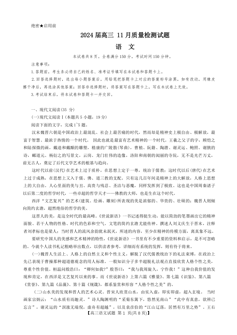 湖南省衡阳市2023-2024学年高三上学期11月质量检测 语文