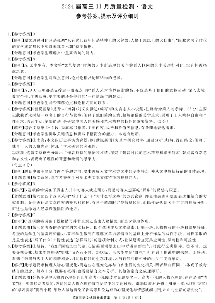 湖南省衡阳市2023-2024学年高三上学期11月质量检测 语文答案