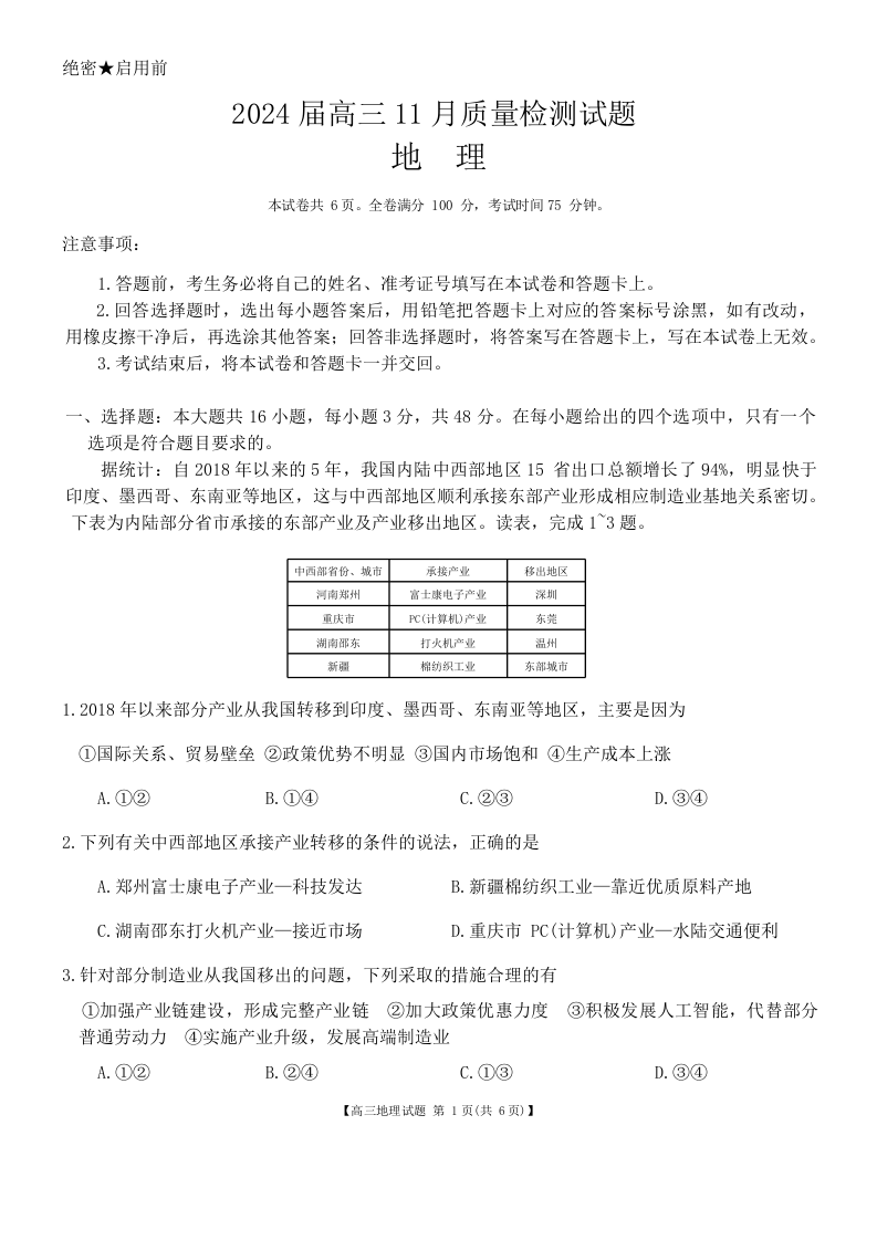 湖南省衡阳市2023-2024学年高三上学期11月质量检测 地理