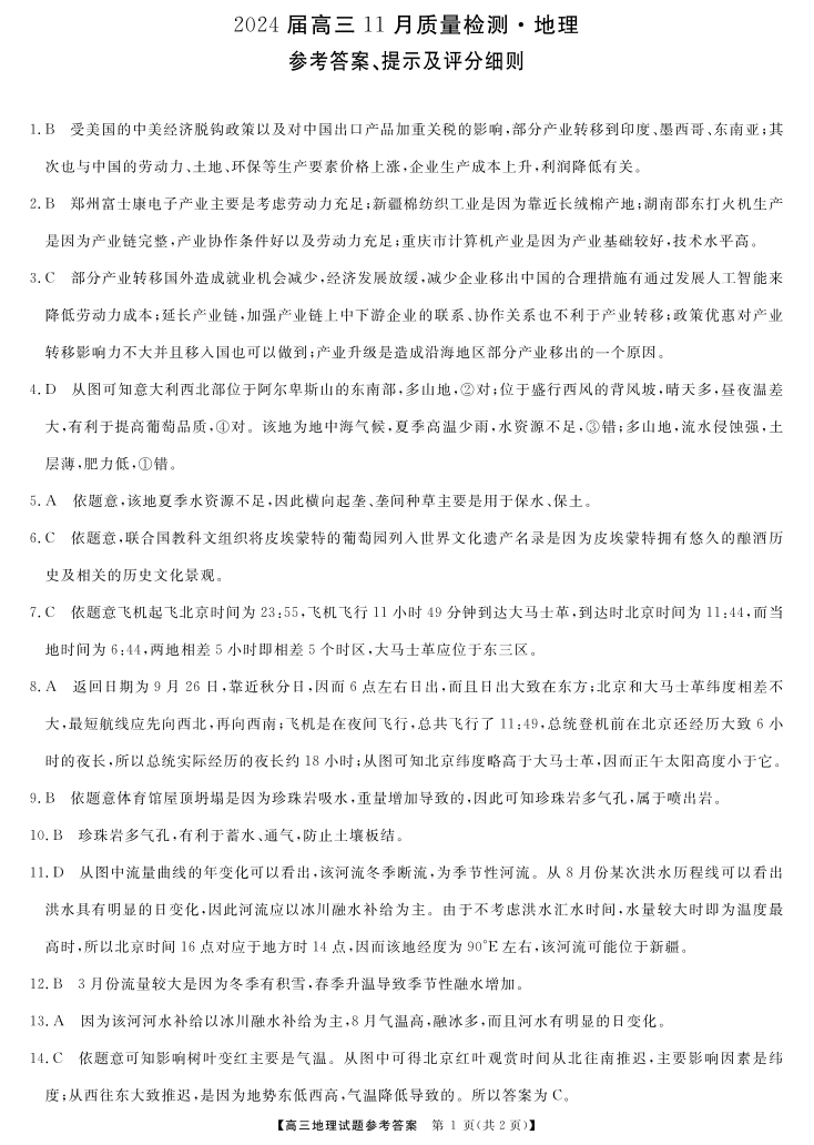 湖南省衡阳市2023-2024学年高三上学期11月质量检测 地理答案
