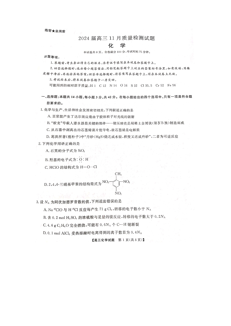 湖南省衡阳市2023-2024学年高三上学期11月质量检测 化学