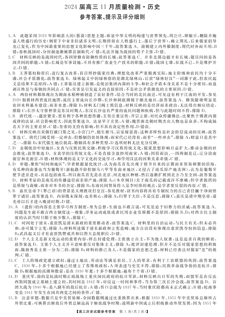 湖南省衡阳市2023-2024学年高三上学期11月质量检测 历史答案