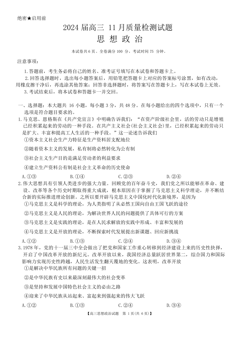 湖南省衡阳市2023-2024学年高三上学期11月质量检测 政治