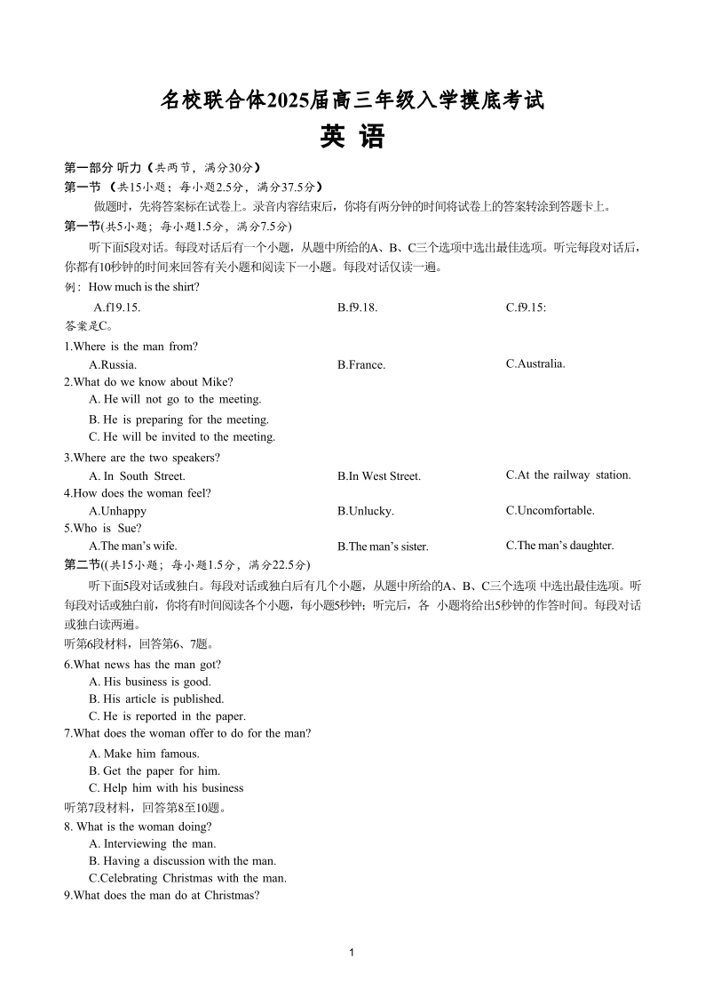 湖南省名校联合体2024-2025学年高三上学期入学摸底考试+英语