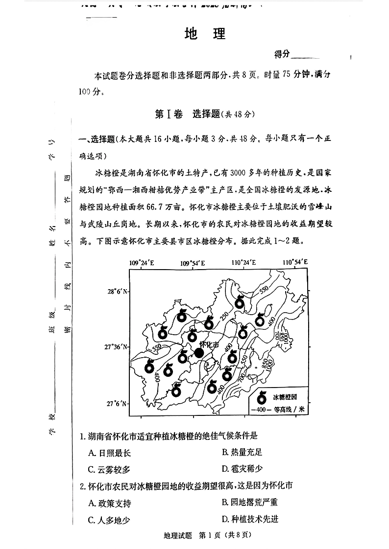 湖南省名校联合体2024-2025学年高三上学期入学摸底考试+地理