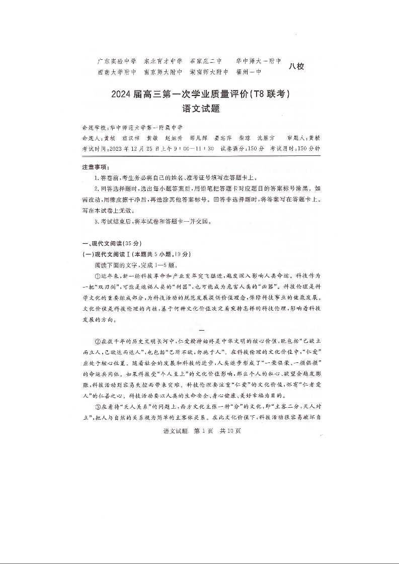 2024届八省八校高三第一次学业质量评价(T8联考)语文