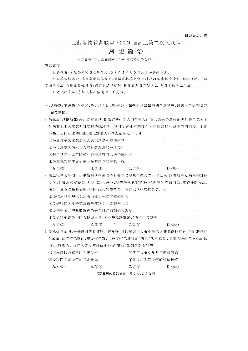 湖南省三湘名校联盟2023-2024学年高三上学期12月第二次联考 政治