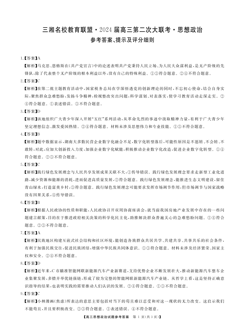 湖南省三湘名校联盟2023-2024学年高三上学期12月第二次联考 政治答案