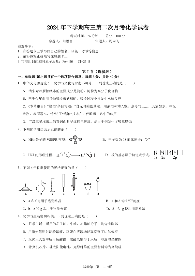 湖南省邵东市第一中学2025届高三9月第二次月考+化学