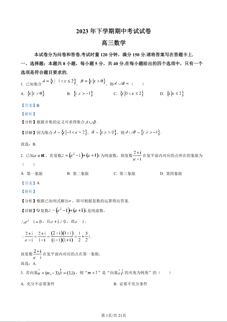 湖南省邵阳市武冈市2024届高三上学期期中考试 数学答案