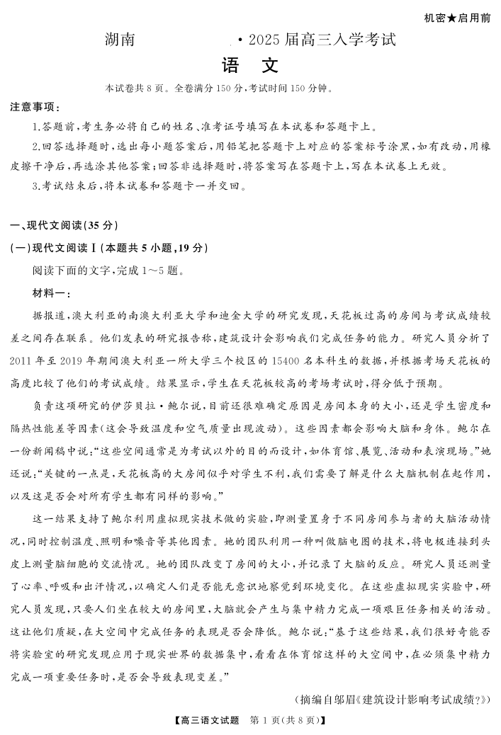 湖南省湖南天壹名校联盟2025届高三8月入学联考考试+语文