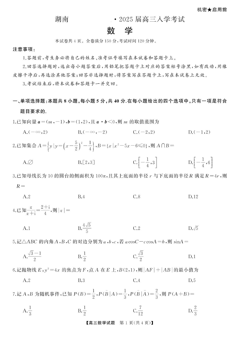 湖南省湖南天壹名校联盟2025届高三8月入学联考考试+数学