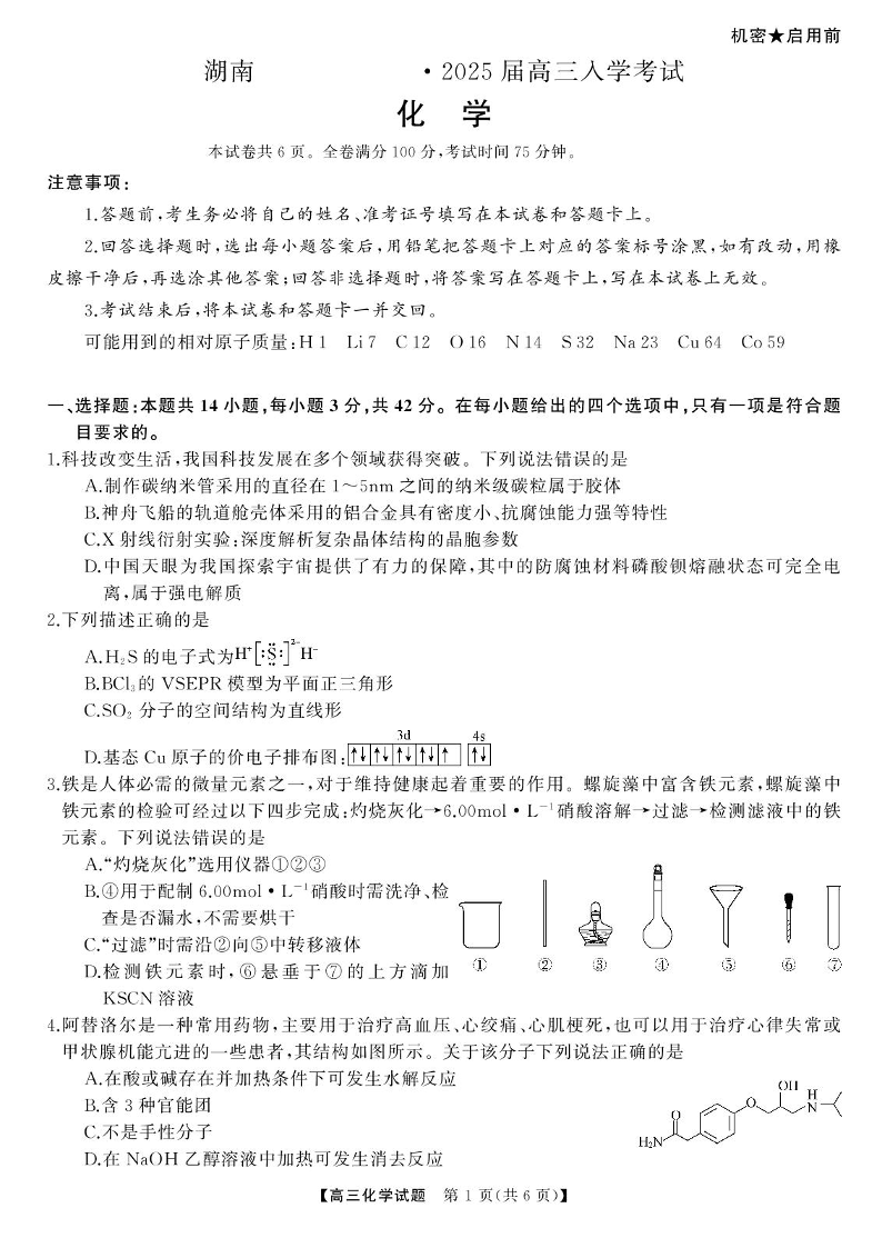湖南省湖南天壹名校联盟2025届高三8月入学联考考试+化学
