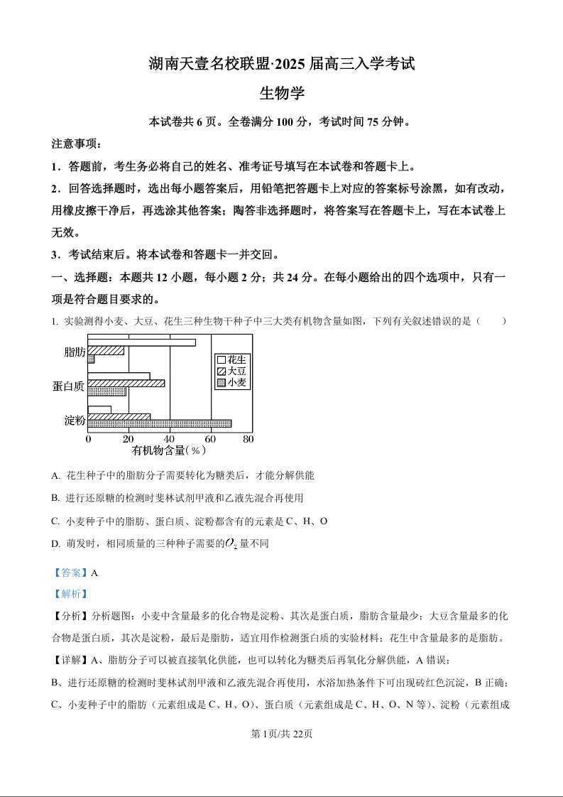 湖南省湖南天壹名校联盟2025届高三8月入学联考考试+生物答案