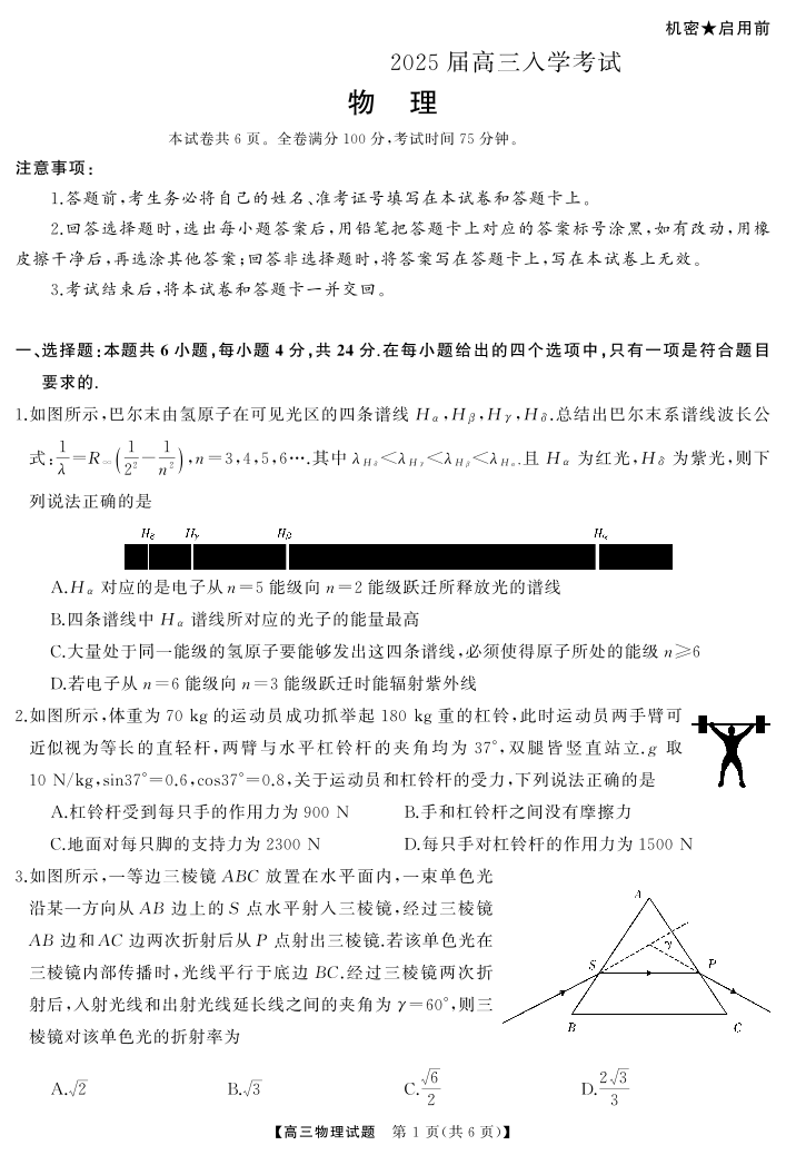 湖南省湖南天壹名校联盟2025届高三8月入学联考考试+物理
