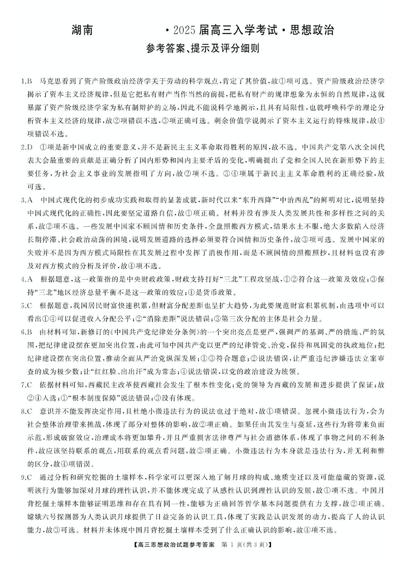 湖南省湖南天壹名校联盟2025届高三8月入学联考考试+政治答案