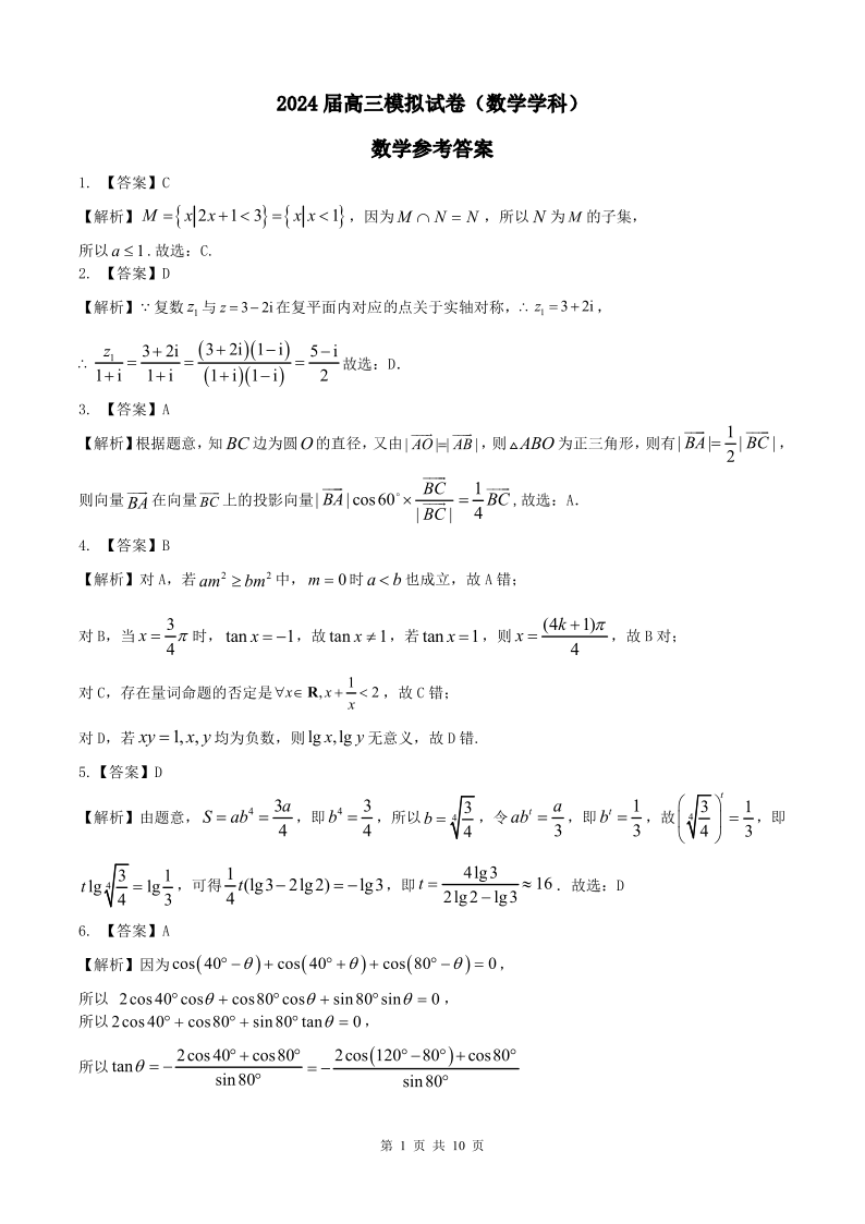 湖南省湘西州吉首市2024届高三上学期第二届中小学生教师解题大赛 数学参考答案