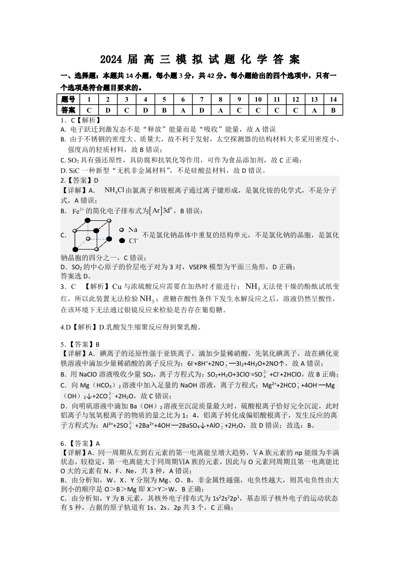 湖南省湘西州吉首市2024届高三上学期第二届中小学生教师解题大赛 化学参考答案