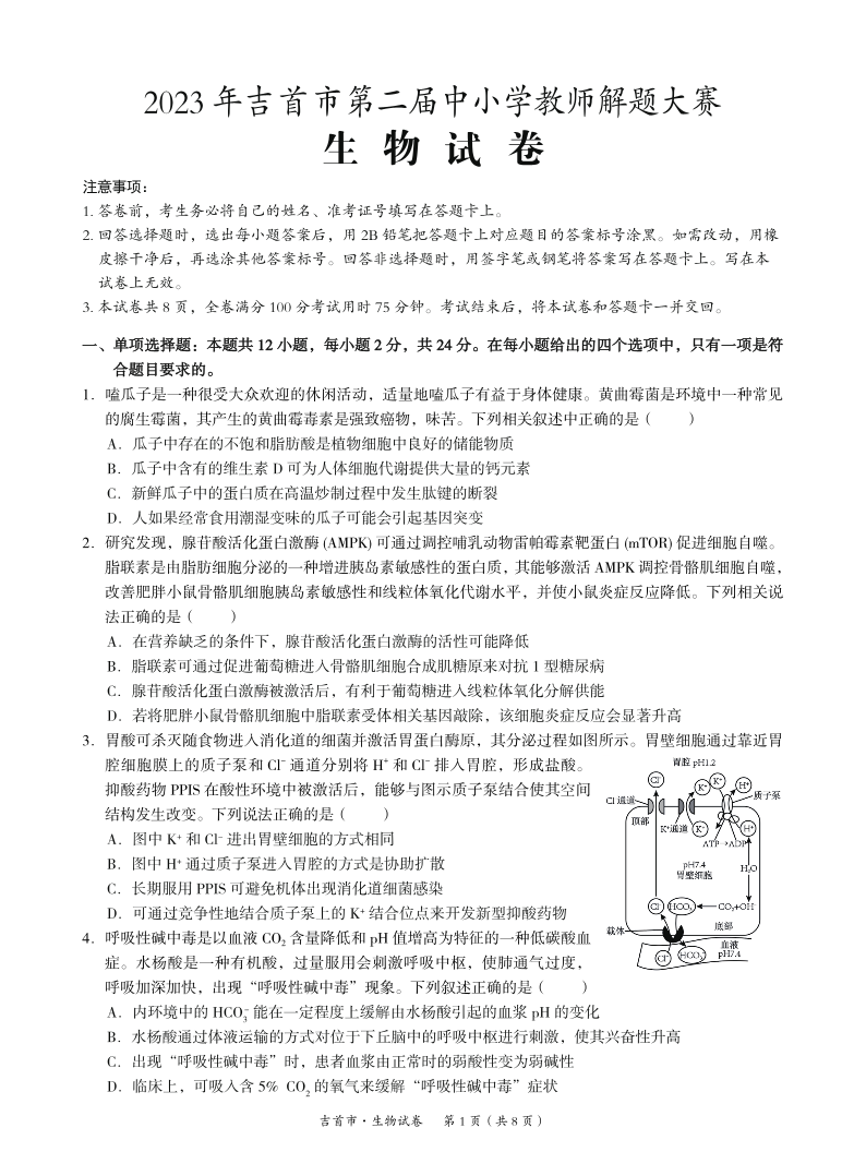 湖南省湘西州吉首市2024届高三上学期第二届中小学生教师解题大赛 生物