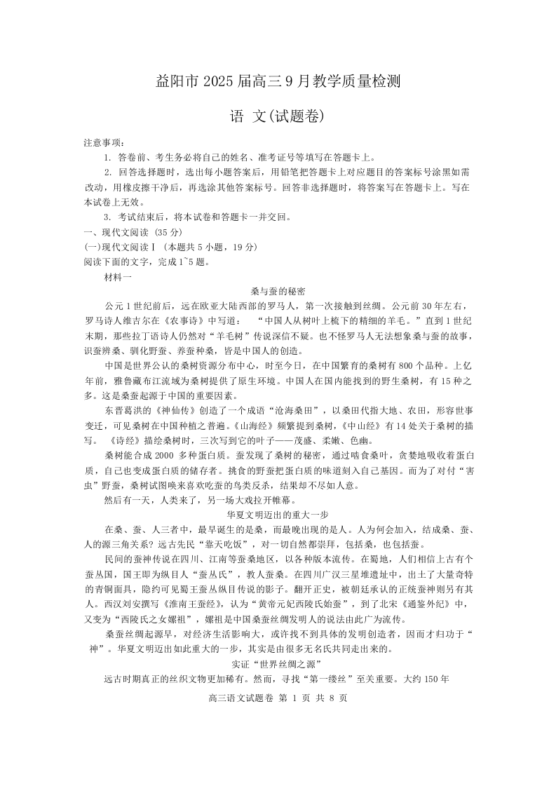 湖南省益阳市2025届高三9月教学质量检测+语文