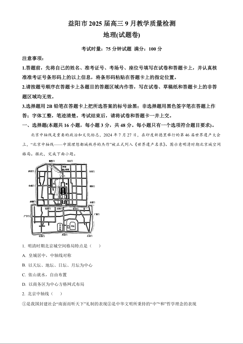 湖南省益阳市2025届高三9月教学质量检测+地理答案