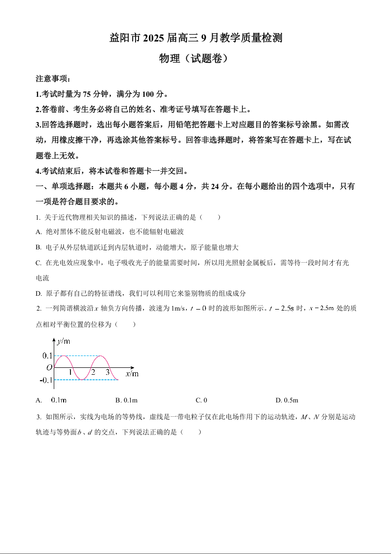 湖南省益阳市2025届高三9月教学质量检测+物理