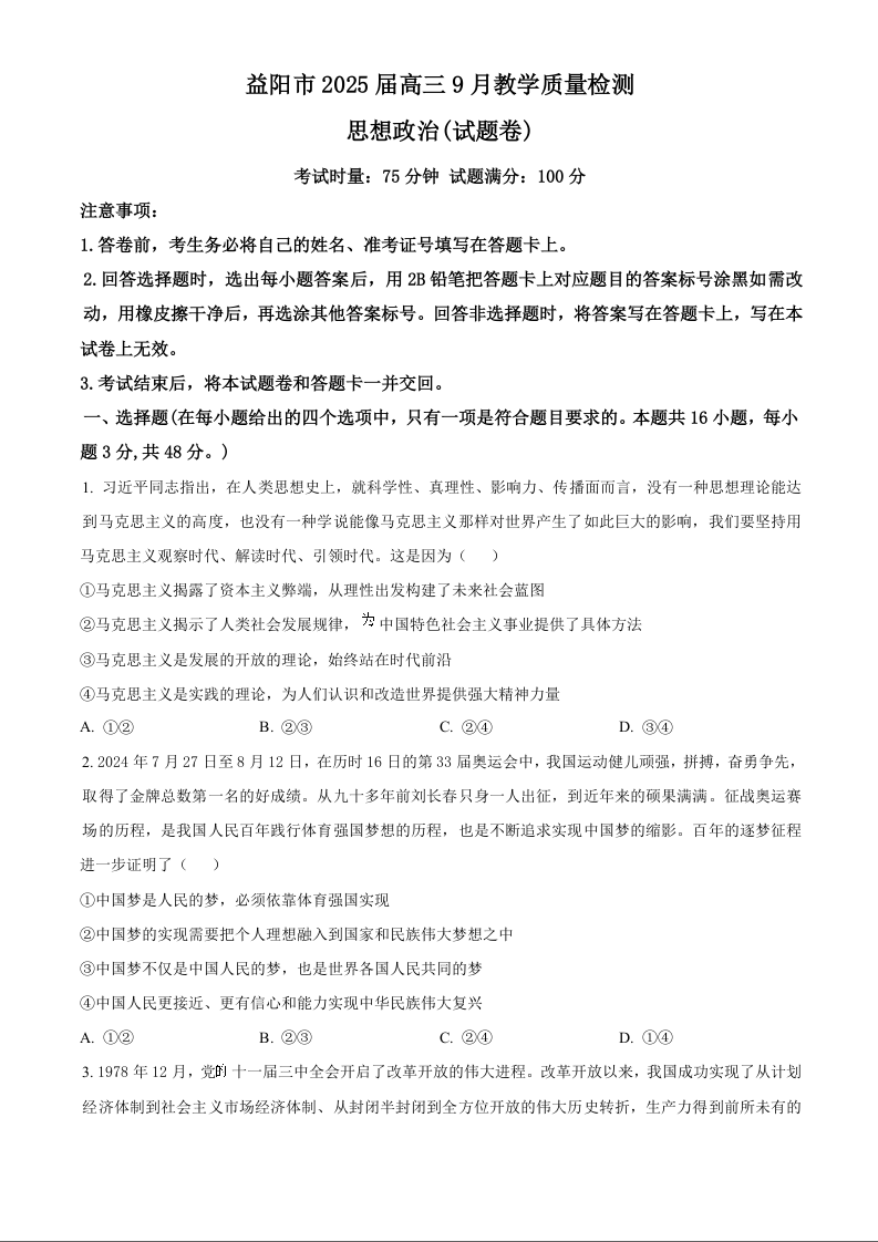 湖南省益阳市2025届高三9月教学质量检测+政治