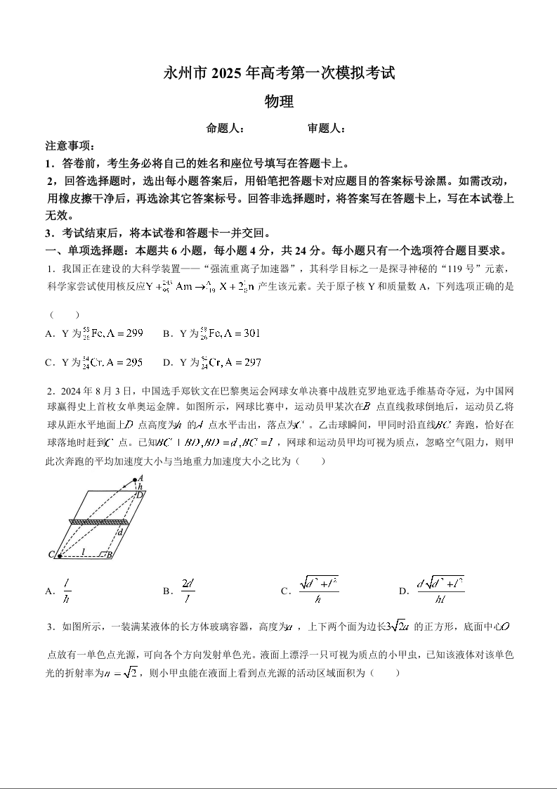 湖南省永州市2025年高考第一次模拟考试+物理