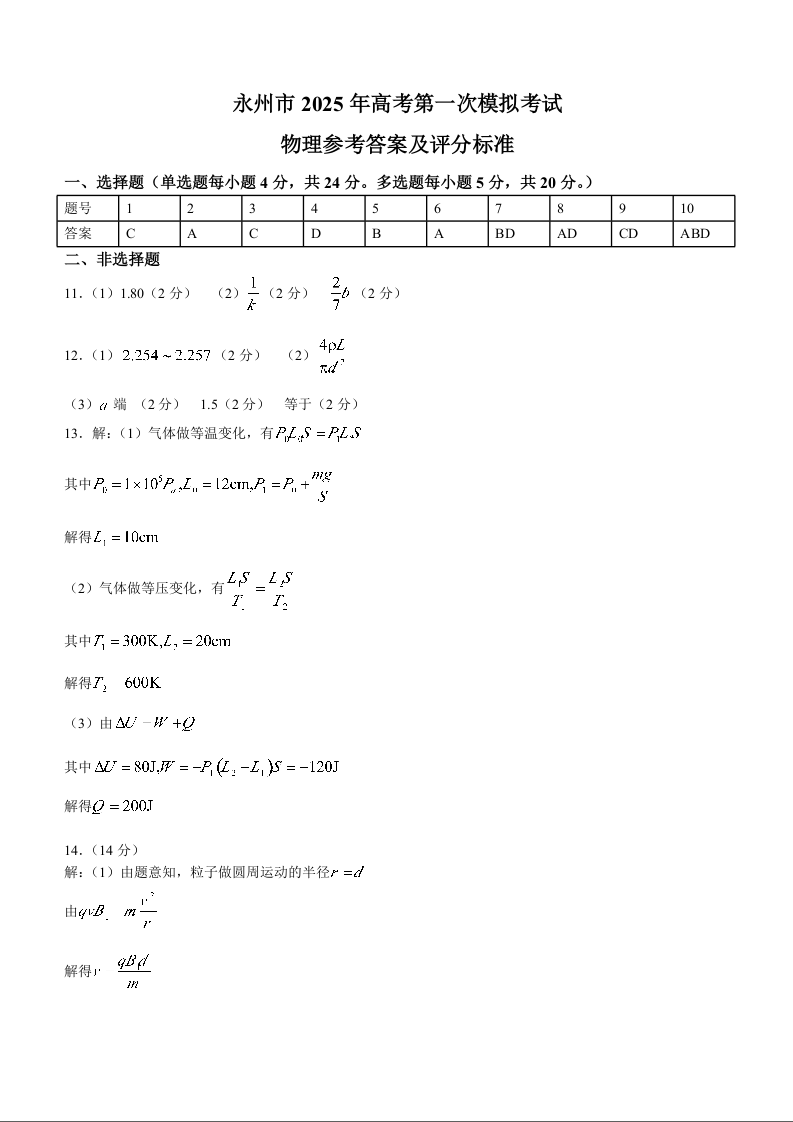 湖南省永州市2025年高考第一次模拟考试+物理答案