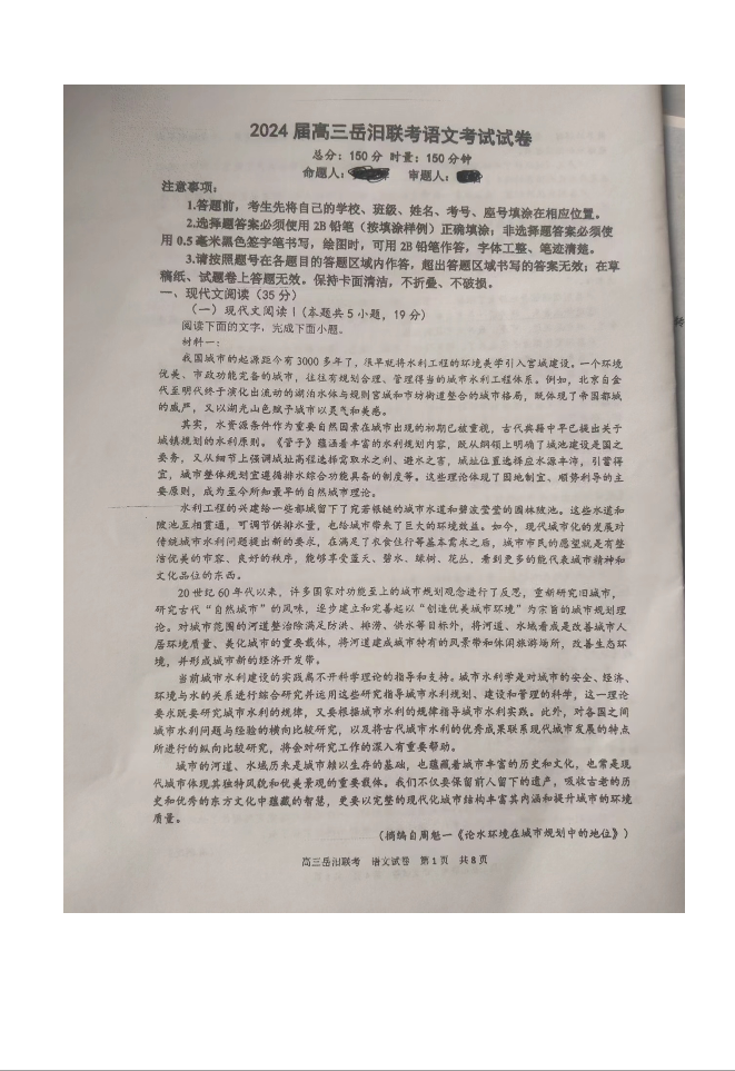 湖南省岳阳县第一中学、汨罗市第一中学2023-2024学年高三上学期11月期中联考 语文