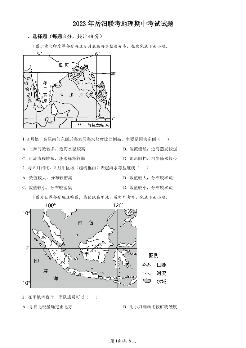湖南省岳阳县第一中学、汨罗市第一中学2023-2024学年高三上学期11月期中联考 地理