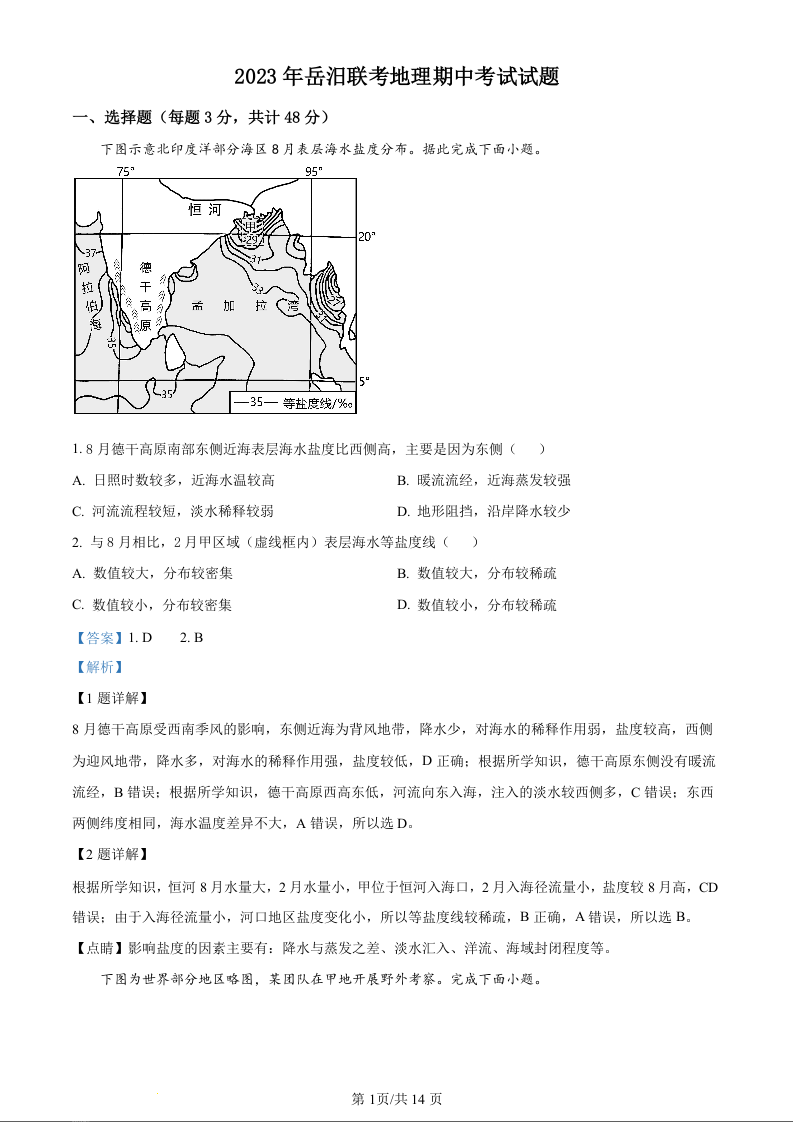 湖南省岳阳县第一中学、汨罗市第一中学2023-2024学年高三上学期11月期中联考 地理答案