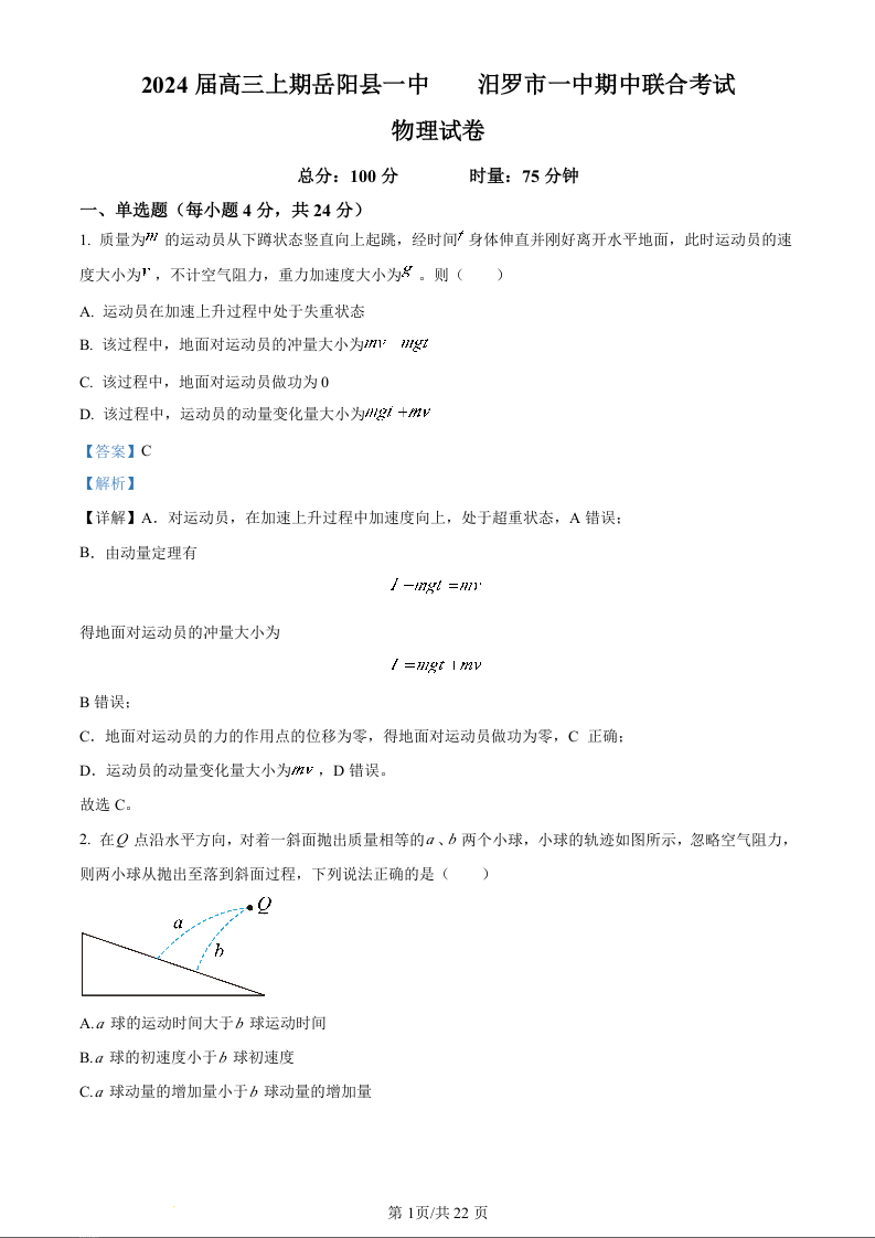 湖南省岳阳县第一中学、汨罗市第一中学2023-2024学年高三上学期11月期中联考 物理答案