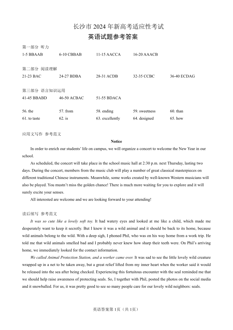 湖南省长沙市2024年新高考适应性考试 英语答案