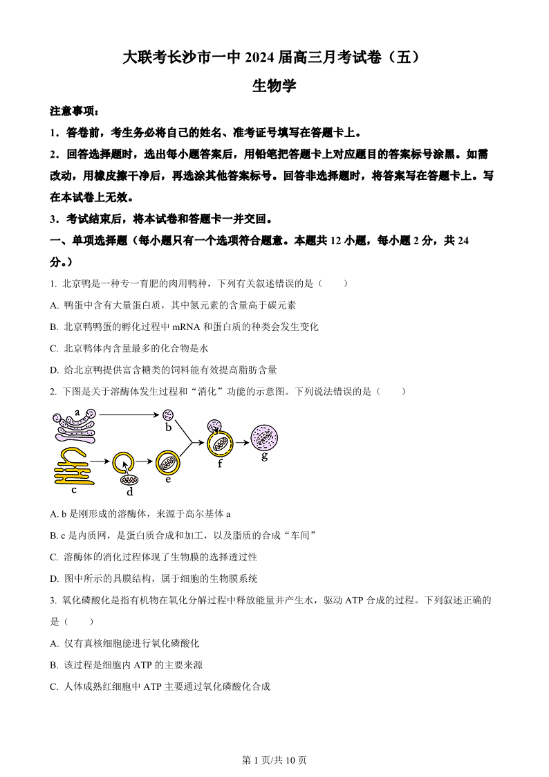 湖南省长沙市第一中学2023-2024学年高三上学期月考(五)生物