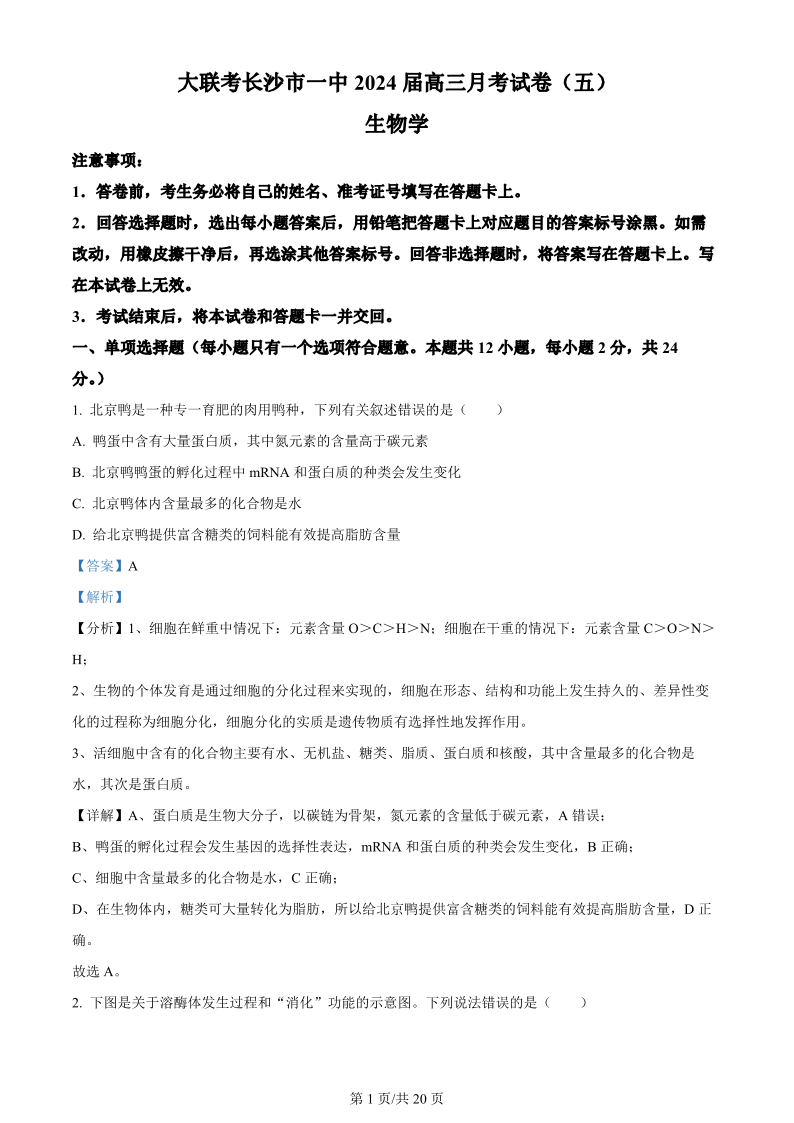 湖南省长沙市第一中学2023-2024学年高三上学期月考(五)生物答案