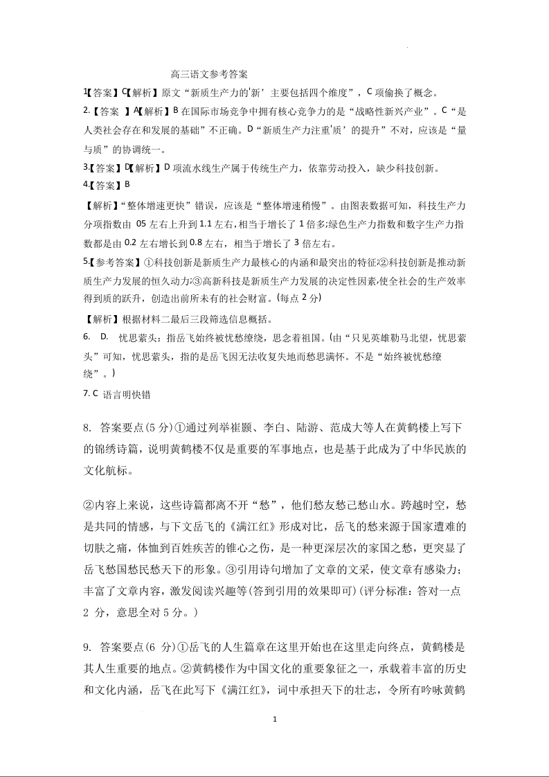 湖南省长沙市浏阳市第一中学2024年6月份高考适应性考试+语文答案